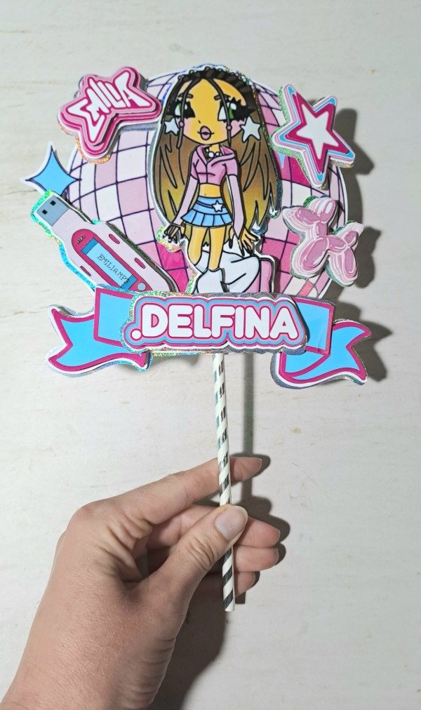 Caketopper realizado en distintas capas y texturas de papel con detalles de glitter, holograficos o apliques.